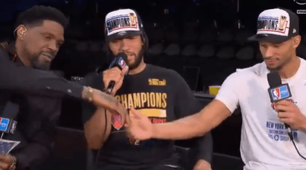 賽后,需個像約尼克斯球員約什-哈特接受前NBA球員猶多尼斯-哈斯勒姆的采訪。